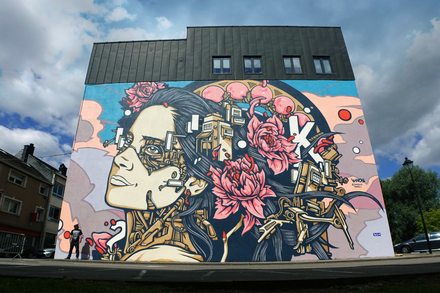 Which statement most accurately describes the blend of naturalistic and biomechanical elements in the woman's facial features depicted in the mural?